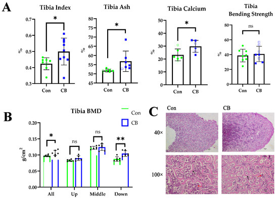 We supplemented hens with CB by oral gavage and examined bone development. CB significantly improved the tibial index (p < 0.05) and increased the ash (p < 0.05) and calcium content (p < 0.05) of the tibia, but no significant change was seen in the bending strength of the tibia (p > 0.05) (Figure 1A). We explored why the flexural strength did not change and found that feeding with CB increased bone mineral density (BMD) on the whole and in both ends of the tibia (p < 0.05) but not in the mid-segment (i.e., the bending strength testing site) (p > 0.05) (Figure 1B). The results of H&E staining of the tibia revealed that CB increased the number and thickness of tibial trabecular bones (Figure 1C), indicating that CB regulates tibial bone development in layer pullets.