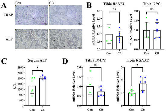 Bone is regulated by both osteoblasts and osteoclasts [26]. RANKL is a key factor in osteoclastogenesis; RANKL and RANK combine to mediate osteoclastogenesis and signaling, while OPG inhibits osteoclastogenesis by preventing RANKL–RANK interaction [40]. Mature osteoblasts deposit a mineralized matrix and begin to express ALP, thus serving as a major marker of the bone formation process [28]. RUNX2 is expressed in uncommitted mesenchymal cells; it directs the differentiation of mesenchymal stem cells into osteoblasts and plays an important role in indicating bone formation [41]. This study found that CB increased serum ALP levels and tissue RUNX2 mRNA levels but did not affect the expression of RANKL and OPG. Therefore, we concluded that CB exercises its bone development-promoting activity by regulating the activity of osteoblasts.