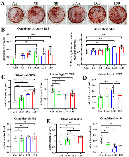 The RUNX2/BMP2 pathway is another key pathway for osteoblast maturation and differentiation. The experiments showed that LCon, LCB, and LSB treatments all increased BMP2 compared to the Con group (p < 0.05), but no differences among the three groups were found (p > 0.05) (Figure 4D). Only the LCB treatment significantly increased the expression of RUNX2 (p < 0.01) (Figure 4D).