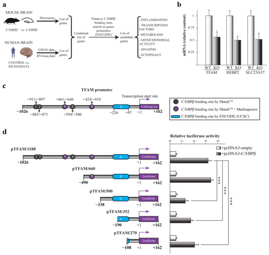 Implication of C/EBPβ in the regulation of mitochondrial genes in the context of Parkinson’s disease. (a) Scheme of the process followed for the generation of a list of candidate genes regulated by C/EBPβ related to PD. Previous microarray data obtained in C/EBPβ−/− mice were combined with published data of genome-wide association study (GWAS) and RNA-seq in PD patients vs. controls. Then, C/EBPβ binding sites were searched for among the promoters of genes of the resulting list by the use of the ENCODE-UCSC database. Several candidate genes involved in PD and possibly regulated by C/EBPβ were identified. (b) RT-qPCR analysis of C/EBPβ+/+ (WT) and C/EBPβ−/− (KO) mice hippocampus mRNA of mitochondrial genes Tfam, Hebp2, and Slc25a37. Data are shown as the mean ± SE of the RNA relative levels in n = 10 WT animals and n = 5 KO animals. * p ≤ 0.05 (t-student). (c) In silico determination of putative C/EBPβ binding sites on TFAM promoter by the use of MatchTM, MatInspector, and ENCODE (UCSC) program as indicated. (d) Effect of C/EBPβ overexpression on the activity of different TFAM promoter segments analyzed by transient transfection in SH-SY5Y cells. The data represent the mean ± SE of luciferase activity referred to basal and determined in triplicate in at least four independent experiments. *** p ≤ 0.001 (ANOVA-Bonferroni).