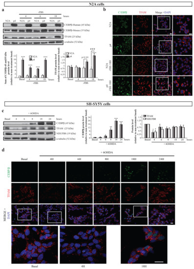 Relation of C/EBPβ and TFAM protein levels in neurons under differentiation or oxidative stress conditions. N2A and p4 (overexpressing C/EBPβ) cells were grown in serum free medium (-FBS) to induce differentiation for 4, 6, and 18 h. (a) Representative immunoblots and quantifications showing human (45 kDa) and mouse (35 kDa) C/EBPβ, TFAM, and α-tubulin protein levels in these cells. Data are presented as the mean of the relative protein levels normalized by α-tubulin levels in at least four independent experiments ± SE. *** p ≤ 0.001 vs. non-treatment basal, ### p ≤ 0.001 vs. control N2A cells with the same treatment (ANOVA-Bonferroni). (b) Representative immunofluorescence images showing C/EBPβ (green) and TFAM (red) expression in the same cell cultures. Nuclei were stained with DAPI (blue). Insets show high magnification of the selected area. Scale bar = 20 µm. (c) Dopaminergic cell line SH-SY5Y cultures were treated with 6-hydroxydopamine (6OHDA, 35 µM) for 4, 6, 8, 18, and 24 h to simulate oxidative stress present in PD and immunoblot analysis was performed to determine C/EBPβ, TFAM, and NDUFB8 protein levels. Data on the graphs correspond to the mean of the relative levels of these proteins normalized by α-tubulin in four independent experiments ± SE. * p ≤ 0.05, ** p ≤ 0.005, *** p ≤ 0.001 (ANOVA-Bonferroni). (d) Representative images of C/EBPβ (green) and TFAM (red) immunofluorescence analyses in the same cells are shown with DAPI stained nuclei. Insets show high magnification of the selected area. Scale bar = 20 µM.