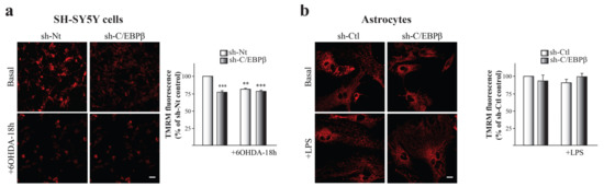 C/EBPβ knock-down causes mitochondrial depolarization in SH-SY5Y neurons but not in astrocytes. Mitochondrial membrane potential (ΔΨm) was estimated by live-cell imaging using TMRM in a redistribution mode (40 nM) in (a) SH-SY5Y cultures infected with lentiviral particles containing a Non-Targeting shRNA (sh-Nt) or with sh-C/EBPβ, which were treated with 35 µM 6OHDA for 18 h, and in (b) astrocytes primary cultures infected with lentiviral particles containing a shRNA against luciferase (sh-Ctl) or with sh-C/EBPβ, which were treated with 10 µg/mL of LPS for 24 h. Representative TMRM fluorescence images are shown and data are presented as the mean ± SE of TMRM fluorescence. TMRM fluorescence in control sh-Nt cells (a) or control sh-Ctl cells (b) was set as 100% and the rest of cellular conditions were referred to as percentage of the control cells measured in five different counting fields from at least three independent experiments. ** p ≤ 0.005, *** p ≤ 0.001 (ANOVA-Bonferroni). Scale bar = 20 μM.