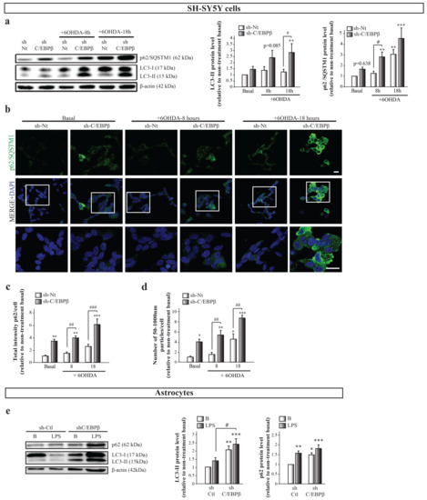C/EBPβ silencing results in the accumulation of autophagy markers in cellular models of PD. SH-SY5Y cell cultures were infected with lentiviral particles containing a control sh-Nt or with a shRNA targeting C/EBPβ (sh-C/EBPβ). Cultures were treated with 35µM 6OHDA for 8 and 18 h and (a) immunoblot analyses were performed to determine LC3-II and p62/SQSTM1 protein levels. Data on the graphs correspond to the mean of the relative levels of these proteins normalized by β-actin in at least four independent experiments ± SE. (b) Representative images of p62/SQSTM1 (green) immunofluorescence analyses in the same cells with DAPI stained nuclei. Scale bar = 20 µM. The bar graphs show (c) the mean of the p62/SQSTM1 fluorescence intensity per cell (relative to non-treatment basal) ± SE or (d) the number of p62-containing particles with a diameter among 50–1000 nM per cell ± SE, which were considered autophagic vesicles (AVs). Both measurements were performed in five counting fields of three independent experiments. (e) Immunoblot analysis to determine LC3-II and p62/SQSTM1 protein levels in astrocytes primary cultures infected with lentiviral particles containing a control shRNA sequence (sh-Ctl) or with shRNA targeting C/EBPβ (sh-C/EBPβ), and treated with 10 µg/mL of bacterial lipopolysaccharides (LPS) for 24 h. Data on the graphs correspond to the mean of the relative levels of these proteins normalized by β-actin in four independent experiments ± SE. * p ≤ 0.05, ** p ≤ 0.005, *** p ≤ 0.001 vs. non-treatment basal, # p ≤ 0.05, ## p ≤ 0.005, ### p ≤ 0.001 vs. control (sh-Nt or sh-Ctl) cells with the same treatment (ANOVA-Bonferroni).