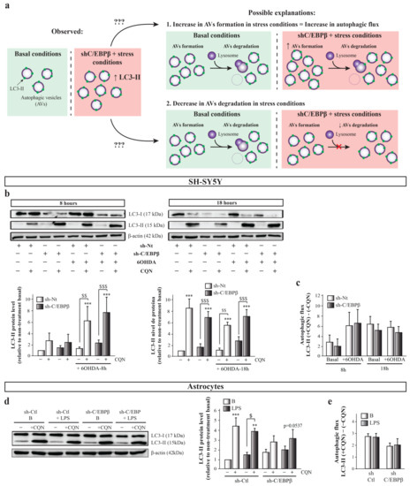 Importantly, as autophagy is the net result of autophagosomes formation and degradation, this rise in autophagic markers levels can be due either to an increase in new autophagosome formation, that is, an increase in autophagy induction; or to an alteration in the autophagy pathway that avoids autophagosomes degradation (Figure 6a). For this reason, a more accurate way to study whether there is an alteration in autophagic activity in our experimental model is to measure the autophagic flux, which reflects the total amount of AVs that are delivered to and degraded by the lysosomes. Autophagic flux can be measured as the difference of autophagy marker levels in the presence and absence of lysosomal inhibitors [57]. In this work, we used the lysosomal inhibitor chloroquine (CQN, 30 µM), a compound that is trapped in acidic environments, as lysosomes, causing an increase in their pH and, therefore, inhibiting the activity of the degradative enzymes [58]. Immunoblot analysis of LC3-II showed that CQN caused a marked increase in its levels under all conditions tested (Figure 6b). We next calculated the autophagic flux in the different experimental groups by subtracting the value of LC3-II in the absence of CQN to the value of this protein level in the presence of the inhibitor. As shown in Figure 6c, no significant differences in autophagic flux were detected between the experimental groups, although a trend of an increase of autophagic flux with 8 h of 6OHDA treatment was observed in sh-Nt and sh-CEBPβ cells. This trend is probably due to the high variability occurring in this experimental approach that is mainly due to the high velocity of the autophagy process in the SH-SY5Y cell line, which results in very low LC3-II protein levels in basal conditions [59]. This fact makes very difficult its detection by immunoblot, generating a high variability between experiments depending on the capacity of measuring LC3-II basal levels in each occasion. For this reason, we also measured autophagic flux with p62/SQSTM marker and again no significant differences were observed (Figure S2). In this case, a decreasing trend in autophagy flux is observed in sh-Nt cells after 6-OHDA treatment during 18 h, which does not occur in sh-C/EBPβ cells. A possible explanation for this is that, as abovementioned, oxidative stress may be transcriptionally regulating p62/SQSTM1 levels [56]. The lack of significant differences in autophagic flux indicates that the AVs accumulation observed in sh-C/EBPβ cells under oxidative stress conditions is not due to an increase in autophagy induction but to an alteration in their degradation. Then, C/EBPβ could participate in the regulation of genes involved in the AVs degradation step of the autophagy process, which are induced by 6OHDA in SH-SY5Y cells. In a similar manner, CQN produced an increase in LC3-II levels in astroglial cultures in all studied conditions (Figure 6c). Similar to that performed in SH-SY5Y cells, we calculated the autophagic flux with no significant differences between the studied experimental groups (Figure 6e). This indicates that, also in astrocytes, the accumulation of AVs previously described is due to a failure in their degradation but not to an increased induction of their formation. However, it is important to consider that in silenced astroglial cultures, there is a trend of decrease in autophagic flux, which may be due to a failure in the autophagy induction in this cell type.