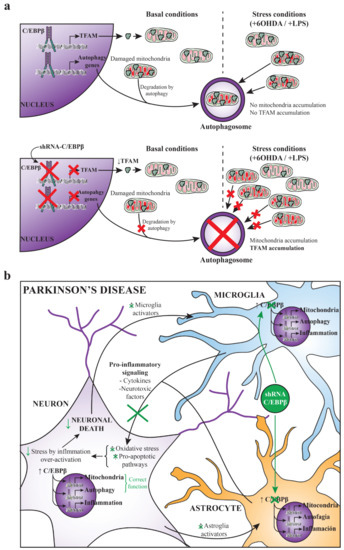 (a) Hypothesis of autophagy failure and mitochondria accumulation due to C/EBPβ silencing. With physiological levels of C/EBPβ, cells express TFAM and damaged mitochondria can be normally degraded by autophagy under basal and stress conditions produced by 6OHDA or LPS treatment. When C/EBPβ is silenced, TFAM expression regulated by this transcription factor is decreased; however, mitochondria degradation failure by the impairment of autophagy pathway could cause these organelles to accumulate and, consequently, the accumulation of TFAM. (b) C/EBPβ as a therapeutic target for the treatment of Parkinson’s disease. This scheme summarizes a possible strategy for the treatment of PD by silencing C/EBPβ specifically in astrocytes and microglia. Some of the events that take place in PD progression are shown in black. The beneficial effects of this approach that would increase neuronal survival are shown in green.