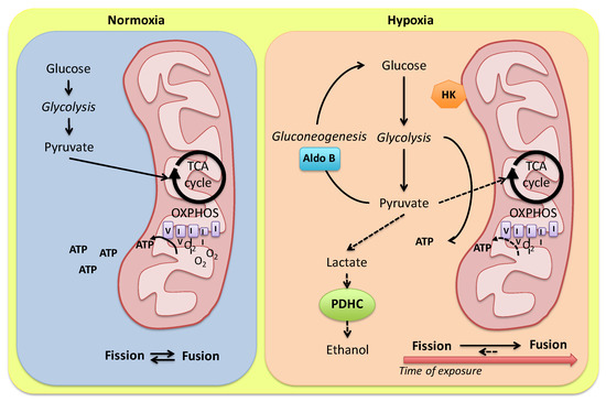 Model for alternative routes of pyruvate metabolism in the Carassius auratus heart. In the presence of O2, pyruvate from glycolysis is converted to acetyl-CoA and addressed to mitochondria for the oxidative phosphorylation. Under hypoxia, a tight modulation of glycolysis enzymes may finely regulate anaerobic ATP production by modulating glycolytic vs. gluconeogenic flux. Pyruvate conversion to ethanol is reduced by a low cardiac expression of alternative PDHC sub-units (see the text for details). A hypoxia-dependent modulation of mitochondria dynamics in relation to the exposure time is proposed. HK: hexokinase; Aldo B: aldolase B; PDHC: pyruvate dehydrogenase complex.
