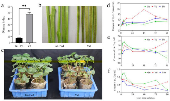 Disease index and symptoms of Verticillium wilt in cotton 20 d after V. dahliae inoculation. (a) The disease index (** p ≤ 0.01). (b) Vascular bundle discoloration. (c) Symptoms of Verticillium wilt in cotton. (d) The content of H2O2. (e) The content of JA. (f) The content of SA. Bars represent SEs.