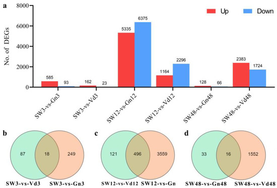 For the DEGs data of multiple comparison groups, we use a Venn diagram to show the situation of genes among different comparison groups (Figure 2b–d). The results indicated that there are 249 DEGs, 3559 DEGs and 33 DEGs at 3 hpi, 12 hpi and 48 hpi, respectively.