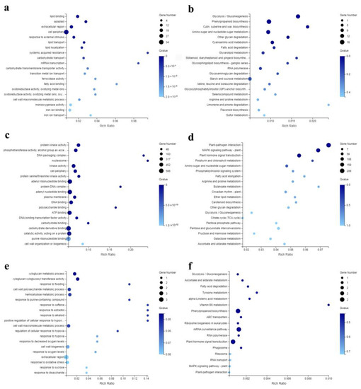 Scatter plot of GO and KEGG pathway enrichment of DEGs. The rich ratio is the ratio of the DEG number to the background number in a particular pathway. The size of the dots represents the number of genes, and the color of the dots represents the range of the Q-value. (a) GO pathways based on DEGs at 3 hpi. (b) KEGG pathways based on DEGs at 3 hpi. (c) GO pathways based on DEGs at 12 hpi. (d) KEGG pathways based on DEGs at 12 hpi. (e) GO pathways based on DEGs at 48 hpi. (f) KEGG pathways based on DEGs at 48 hpi.
