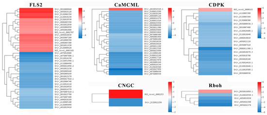 However, 3559 DEGs at 12 hpi were significantly enriched in pathways related to disease resistance. As shown in Figure 3d, for the plant–pathogen interaction, MAPK signaling pathway—plant and plant hormone signal transduction (Figure 3d and Table 1), there were 39 FLS2 genes, 17 upregulated and 22 downregulated; 2 CNGC genes, 1 upregulated and 1 downregulated; 29 CaMCML genes, 1 upregulated and 28 downregulated; 19 calcium-dependent protein kinase (CDPK) genes, 1 upregulated and 18 downregulated; and 5 Rboh genes, 1 upregulated and 4 downregulated (Figure 4). These genes were related to the metabolism of reactive oxygen species (ROS), Ca2+ and NO. In the MAPK signaling pathway—plant pathway, 166 DEGs regulated 31 crucial points related to FLS2, H2O2, ethylene (ET), jasmonic acid (JA), abscisic acid (ABA), ROS and Ca2+ (Figure S5). In the plant hormone signal transduction pathway, 154 DEGs were significantly upregulated or downregulated in JA, ET, ABA, brassinosteroid, auxin and gibberellin pathways, which may play an important role in resistance of cotton to V. dahliae (Figure S6).
