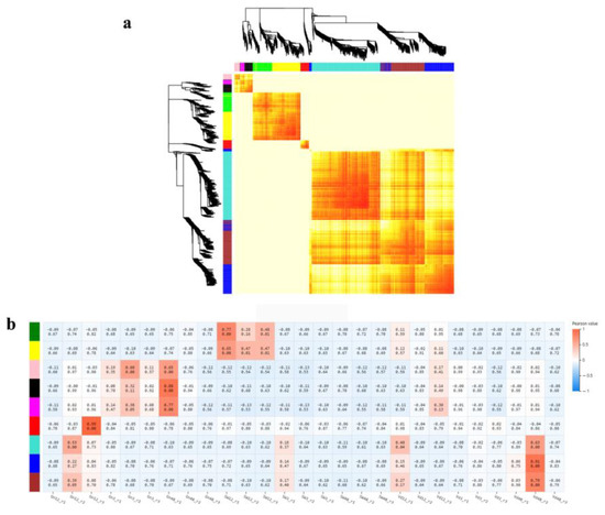 Gene co-expression network analysis by WGCNA. (a) Gene dendrogram colored according to correlations between gene expression levels. Different colors represent different gene modules and indicate coefficients of dissimilarity between genes. (b) Module–sample association. The abscissa represents the samples; the ordinate represents the modules. The numbers in each cell are the correlation coefficient (top) and p-value (bottom). The variation from blue (low) to orange (high) indicates the ranges of the DEGs.