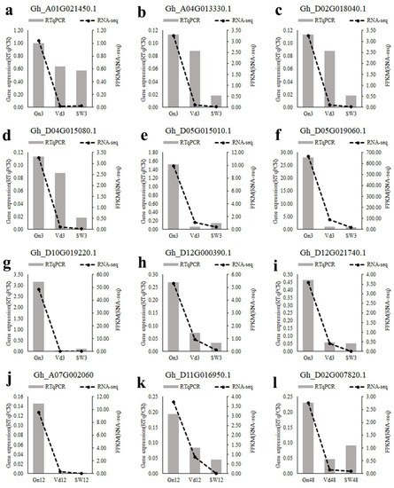 To verify the RNA-Seq data, 12 DEGs were chosen for qRT-PCR; three biological replicates were performed. These 12 genes were selected from significantly enriched KEGG pathways. The expression data obtained by qRT-PCR were consistent with the RNA-Seq results (Table S13), indicating a similar trend between the transcriptome and qRT-PCR datasets (Figure 6). Among the 12 DEGs, a significantly upregulated gene with ID Ghir_D05G019060.1 (Figure 6f) was predicted to encode a xyloglucan glycosyltransferase in the “Glycosylphosphatidylinositol (GPI)-anchor biosynthesis” pathway. Similarly, the expression level of gene Ghir_D05G019060.1 was increased at least 30-fold in cotton induced by CEF08111.