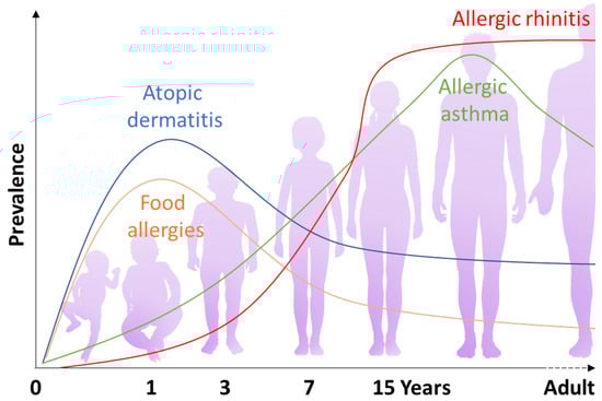 Allergic diseases have become an increasing problem in civilization in recent decades, as allergic symptoms currently affect 150 million Europeans, according to the European academy of allergology and clinical immunology (EAACI) [1]. Coca and Cooke were the first to introduce the term “atopy” and classify the phenomenon of hypersensitiveness in 1923 [2]. Atopy defines the inappropriate immune reaction to allergic stimuli, mediated by high immunoglobulin (Ig) E levels, ultimately leading to clinical manifestations at various localizations within the body. In general, a predisposition to allergy development is shown in atopic individuals, and its manifestation is often seen as a consequence of a characteristic chronological pattern, the so-called “atopic march” (Figure 1). This step-by-step process usually evolves from atopic dermatitis (AD) (also known as hay fever) and food allergies apparition early on during infancy to the emergence of allergic asthma (AA) and allergic rhinitis (AR) later on in childhood. This gradual evolution of the allergic features manifests in parts of the body such as the skin, the digestive tract, and the airway-related axis, which are all anatomical surfaces consisting of epithelial cells continuously exposed to environmental threats [3]. Consequently, it is understood that a combination of (i) a dysregulation in the epithelial barrier favoring allergen penetration and (ii) an unbalanced and overreactive immunological response against allergens caused by activated T helpers 2 (Th2) cells and aberrant regulatory T-cells (Treg) are likely the two main causes responsible for the onset of the atopic march and the allergic manifestations in general [4].