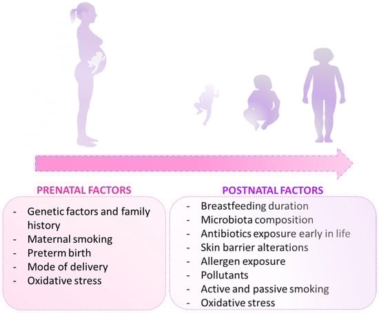 With regard to perinatal environmental factors, the main predicted risk factors are cited in Figure 2 and are grouped according to the specific life stages (from prenatal to post-natal period). Maternal (or parental) smoking exposure during the intrauterine period increases the risk of childhood asthma susceptibility [41]. Preterm birth is recognized as a possible risk factor for atopic diseases; a recent long-term observational study demonstrated that more than 40% of children prematurely born (with gestational age <32 weeks) developed atopic manifestations during the first 5 years of life [42]. Moreover, the mode of delivery was also revealed to influence the occurrence of asthma and allergy in later life; it was observed that cesarean delivery greatly increases the risk of childhood asthma. This is because the mode of birth strongly influences the composition of the microbiota and, in turn, the immune system [43]. Indeed, children born by vaginal delivery showed a higher flora/microbiological diversity with a predominance of Lactobacilli compared to children born by cesarean section, who showed gut dysbiosis. During the perinatal period, one of the cited predicted factors associated with a reduced risk of developing atopic march is breastfeeding duration. Breast milk is not only considered to provide optimal nutrition during the first six months of life, but it is also known as an immunologically living biological substance containing molecules that contribute to infant growth and promote the development of host defense mechanisms. According to a recently published study (based on a questionnaire including approximately 10,700 participants), a longer breastfeeding duration was associated with a reduced odds ratio of childhood asthma and allergic diseases [44]. Other factors, such as the overuse of antibiotics, especially during the first few years of life, can alter the microbiota composition and increase the risk of allergic disease development [45,46].