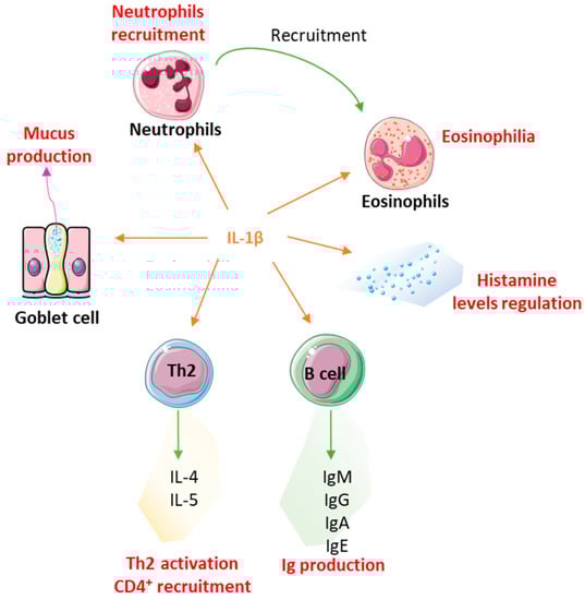 Several transgenic murine models were also employed to document the implication of IL-1β in allergic responses. In particular, a study showed that AHR was dramatically reduced in IL-1α/β−/− BALB/cA background mice subjected to repeated OVA/phosphate-buffered saline (PBS) sensitization without alum, in comparison to wild-type animals [86]. Accordingly, this study delineated the importance of IL-1β in the activation of Th2 cells, as its authors also demonstrated that antigen-specific T-cell proliferative responses, T-cell secretion of IL-4 and IL-5, as well as B cell secretion of antigen-specific IgG1 and IgE were significantly reduced during the course of AHR in IL-1α/β−/− mice compared with wild-type mice. By studying pulmonary immune responses in IL-1R1−/− animals, Schmitz et al. found that IL-1 elicited asthmatic responses in a mild model of allergic asthma induced by repeated sensitizations with intraperitoneal injections of low doses (10 µg) of OVA, without any adjuvant [87]. Their results showed that, in these animals, pulmonary and serum antibody responses, including IgM, IgG, IgA, and IgE isotypes, were considerably reduced compared to control mice. In addition, Th2-type inflammation, CD4+ recruitment, eosinophilia, and goblet cell mucus production decreased in this murine genetic background compared to wild-type animals. The role of IL-1 in the development of AR was also assessed in a toluene-2,4-diisocyanate (TDI)-induced guinea pig model, in which the blockade of the IL-1 pathway was achieved through intra-muscular injections of the IL-1 antagonist receptor (IL-1Ra) [88]. The results showed improvements within the manifestations of the AR symptoms in the treated group compared with the control group, as less edema and decreased histamine levels were found in the nasal mucosa, concomitantly with reduced IgE levels in the blood.
