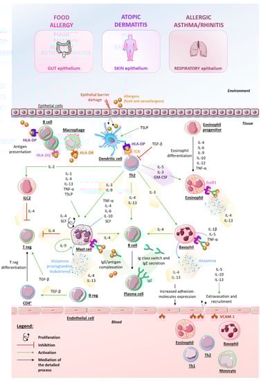 Furthermore, 2LALERG® includes ULD of IL-4, IL-5, IL-6, and IL-13 (Table 1) to down-regulate the expression and/or secretion of these well-known allergy-related ILs. The following paragraphs provide an overview of these cytokines’ main roles in the physiology of atopic-march-related conditions. In particular, their mutual interactions, their implication in skin barrier integrity, and eosinophils functions are developed.