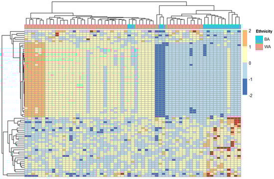 Transcriptome analysis of ERVs in Black American and White American cervical cancer patients. ERVs from 63 cervical cancer patients were mapped to the HERVd database. Differential expression analysis and hierarchical clustering analysis (Euclidean) were performed in DeSeq2 to organize the tumor samples based on their ERV transcription profiles and the ancestry of the cervical cancer patients. The heat map was generated using the normalized expression values for 74 significantly differentially expressed ERVs in BA vs. WA. The plot above depicts the most significant differentially expressed ERVs (padj < 0.1) in BA (n = 15) vs. WA (n = 48) that were differentially expressed among samples of different ancestries (a complete list of differentially expressed ERVs can be found in Supplementary Table S1). Each column represents one sample, and each row represents a single ERV. ERV expression level is indicated by color intensity (−2.0 to 2.0) on a log scale; red indicates ERVs with higher expression, and blue indicates those with lower expression. ERV expression was normalized to the mean of all samples. In the dendrogram on the top, the ancestral origin of each patient is indicated by color. Red indicates patients of predominantly European/Middle Eastern (n = 48) geographical ancestry, while blue represents patients of African ancestry (n = 15). BA = Black American; WA = White American.