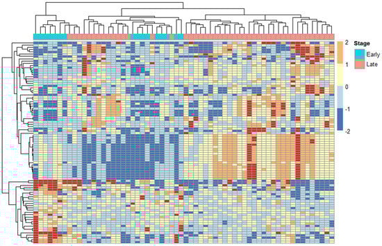 Transcriptome analysis of ERVs in early and locally advanced-stage/late cervical cancer patients. Heatmap generated using the normalized expression values for ERVs from the Human Endogenous Retrovirus database (HERVd). The plot above depicts the most significant ERVs (padj < 0.1) that were differentially expressed among tumor samples of different stages; late/locally advanced patients (n = 46), early patients (n = 16), 1 patient was excluded from this comparison (a complete list of differentially expressed ERVs is displayed in Supplementary Table S3). ERV expression levels is indicated by color intensity (−2.0 to 2.0) on a log scale; red indicates ERVs with higher expression, and blue indicates ERVs with lower expression. Early = FIGO early stage IA1–1B2; Late = FIGO locally advanced stage IB3-IVA