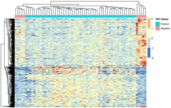 The samples were separated into two groups based on whether the corresponding patients had been diagnosed with HPV. A total of 53 patients were classified as HPV-positive, and the remaining 10 were assigned to the HPV-negative category. The ERV expression data for these samples were provided to DeSeq2 for differential expression analysis. Using the HERVd, we determined that 3313 ERVs were differentially expressed between samples of different HPV status (Supplementary Table S5, Figure 3). Of the differentially expressed ERVs, 1477 were downregulated, and 1836 were upregulated in HPV-negative patients compared to HPV-positive patients.