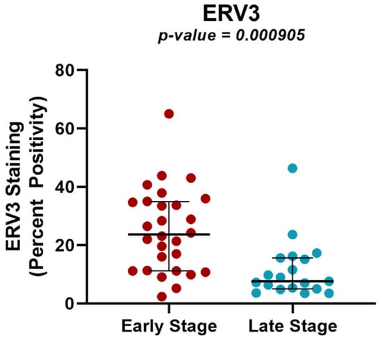 To determine if the differential expression of ERVs between samples of different tumor stage was also manifested at the protein level, we further investigated ERV3. This ERV was selected not only because it was one of the most significant (p < 0.001) differentially expressed genes in locally advanced vs. early-stage tumors in the RNA-seq analysis, but also because it is one of the few ERVs that retains an open reading frame, allowing for the investigation of its protein expression [12]. An ERV3 antibody was applied to a large tissue microarray of tumor tissues from an independent set of early- (n = 28) and locally advanced-stage (n = 19) tumors, and protein production was scored as percent positive pixels using QuPath [23], as described. Consistent with the RNA-seq data, we found significant differences in protein expression for ERV3 (p = 0.000905) in locally advanced- vs. early-stage samples (Supplementary Table S4, Figure 4). HERV-K protein expression was also analyzed, but no significant differential expression at the protein level was found (p = 0.243).