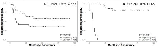 Kaplan–Meier survival plots of recurrence risk for cervical cancer patients. Kaplan–Meier survival analysis of recurrence using low-risk or high-risk models based on (A) clinical factors only (p = 0.06027) compared to (B) a combination of clinical factors and 67-ERV RNA panel expression levels (p = 9.433 × 10−15). The analysis was performed on a test set of n = 47 patients selected from the total cohort of 63 patients.