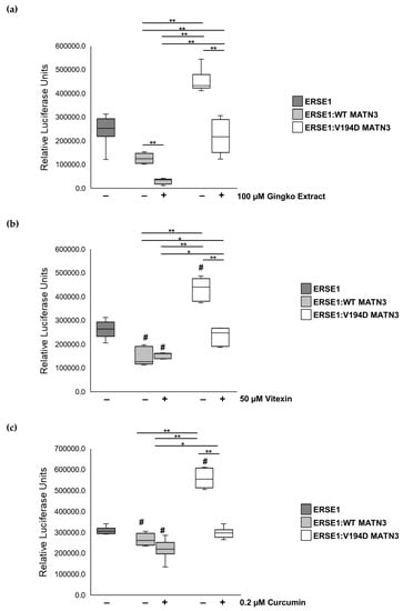 Based on the published literature, we identified three naturally occurring chemicals ((1) Gingko extract—prepared from the leaves of the Gingko biloba tree, (2) vitexin—a glycosylated flavonoid found in plant leaves, (3) curcumin—the principle curcuminoid of turmeric) that were able to reduce ER stress in in vitro and in vivo studies [,,,,,,,,,,]. We have previously shown that pathological ER stress caused by the retention of mutant matrilin-3 can be successfully monitored in vitro using a luciferase ER stress reporter plasmid (ERSE1) []. As ER stress is an attractive target to treat skeletal dysplasias including EDM5, we, therefore, used our established luciferase screening assay to determine if these “natural” chemicals were able to reduce pathological ER stress in cells expressing the archetypal V194D matrilin-3 vWFA mutation.