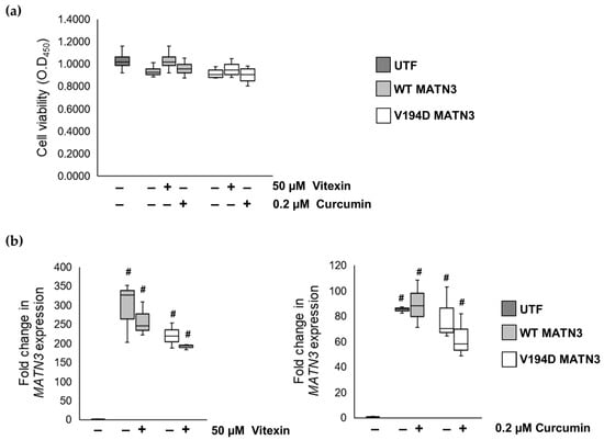 The effects of curcumin and vitexin on reducing pathological ER stress in mutant matrilin-3-expressing cells were independent of reducing both cell viability and MATN3 expression. WT and V194D mutant MATN3-expressing HELA cells were cultured in the presence/absence of either 50 µM vitexin or 0.2 µM curcumin for 48 h. (a) To assess if vitexin or curcumin affect cell viability, a WST1 assay is used, as WST1 absorbance is an indicator of cell viability. The administration of vitexin and curcumin to both WT and V194D mutant MATN3-expressing HELA cells does not significantly affect cell viability as absorbance is comparable between treated and untreated cells. (b) To determine the effects of treatment on gene expression, the expression level of the gene encoding matrilin-3, MANT3, was measured by qPCR. The administration of vitexin and curcumin to both WT and mutant V194D MATN3-expressing HELA cells does not significantly affect the expression of MATN3. (MATN3: matrilin-3, WT: wild-type, UTF: untransfected, # significant to UTF, n = 3).