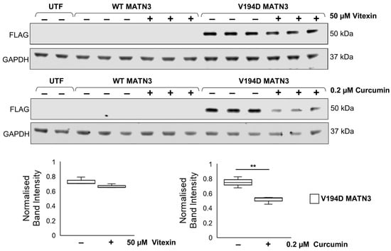 To determine if vitexin/curcumin treatment reduced pathological ER stress due to modulating the intracellular retention of V194D mutant matrilin-3, we assessed intracellular matrilin-3 protein levels in treated/untreated cells by Western blotting. Although gene expression analysis reveals that WT MATN3 cells successfully express wild-type MATN3, because matrilin-3 is a secreted cartilage extracellular matrix protein its expression is not detectable in the cell lysate unlike V194D mutant matrilin-3 that is retained and detected within the cell (Figure 3). Interestingly, treatment with 50 µM vitexin has no effect on the intracellular levels of V194D mutant matrilin-3; however, 0.2 µM curcumin treatment significantly reduces the intracellular expression of the mutant protein by 31.65% (Figure 3). Based on published reports linking curcumin to protein degradation [,], these data suggest that curcumin treatment could potentially promote the degradation of mutant matrilin-3.