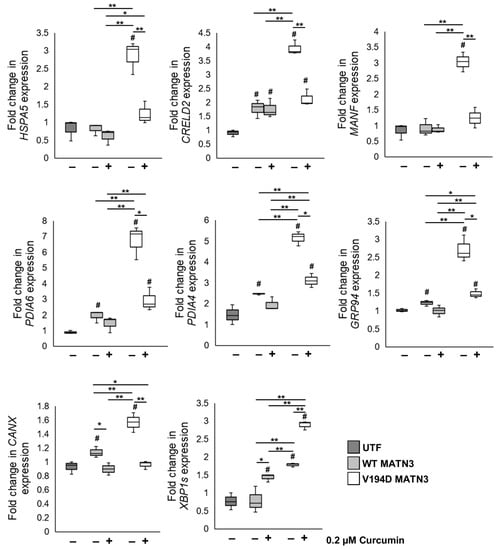 Although curcumin reduces the expression of UPR marker genes, it promotes XBP1 splicing. WT and V194D mutant MATN3-expressing HELA cells were cultured in the presence/absence of 0.2 µM curcumin for 48 h and the expression of UPR marker genes were analysed by qPCR. HSPA5, encoding the master regulator of the UPR BiP, is significantly downregulated in V194D MATN3 cells treated with curcumin. In addition, genes downstream of ATF6/XBP1, including CRELD2, MANF, PDIA6, PDIA4, GRP94, and CANX, are also significantly downregulated in mutant matrilin-3-expressing cells. Interestingly, XBP1 splicing is upregulated following curcumin treatment. (Expression normalised to 18S levels. MATN3: matrilin-3, WT: wild-type, UTF: untransfected, # significant to UTF, * p < 0.05, ** p < 0.005, n = 3).