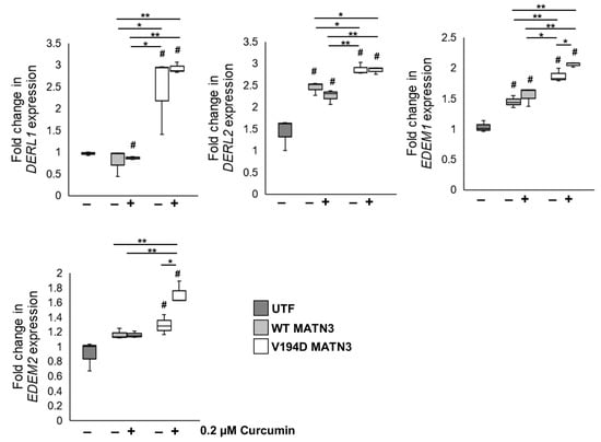 Curcumin promotes the expression of ERAD genes. WT and V194D mutant MATN3-expressing HELA cells were cultured in the presence/absence of 0.2 µM curcumin for 48 h and the expression of ERAD marker genes were analysed by qPCR. Although curcumin treatment of V194D cells significantly upregulates genes encoding EDEM proteins (EDEM1 and EDEM2) that function to recognise and target misfolded proteins for proteasomal degradation, it has no effect on the expression of genes encoding Derlin membrane proteins (DERL1 and DERL2) that function as part of the ER retro-translocon machinery. (Expression normalised to 18S levels. MATN3: matrilin-3, WT: wild-type, UTF: untransfected, # significant to UTF, * p < 0.05, ** p < 0.005, n = 3).