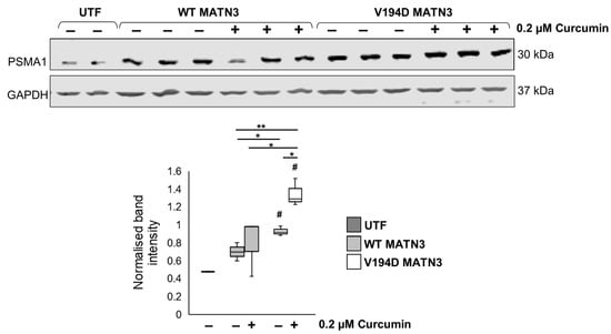 Since curcumin has been shown to result in the upregulation of proteasomal genes [] and our data suggest that mutant matrilin-3 is potentially targeted for degradation by the proteasome following curcumin treatment, we analyse the expression of an essential subunit of the 20S core of the proteasome complex, proteasome subunit alpha-type 1 (PSMA1), by Western blotting. PSMA1 is upregulated 1.33-fold in V194D mutant matrilin-3-expressing cells relative to cells expressing wild-type matrilin-3. Although curcumin does not have any effect on the expression of the PSMA1 proteasome subunit in wild-type cells, treatment with curcumin results in a significant upregulation of PSMA1 in V194D MATN3 cells (Figure 6). More specifically, PSMA1 is upregulated 1.93-fold and 1.45-fold in curcumin-treated V194D cells relative to WT MATN3 cells and untreated V194D MATN3 cells, respectively. Taken together, these findings strengthen our hypothesis that curcumin treatment promotes proteasomal degradation of mutant matrilin-3.
