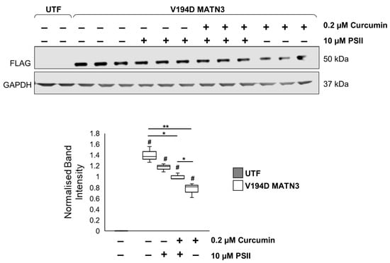 To confirm if mutant matrilin-3 is degraded by the proteasome following the administration of curcumin, a proteasome inhibitor, PSII, is added to block the effects of curcumin. As observed in Figure 3, curcumin treatment significantly reduces the intracellular expression of mutant matrilin-3 (Figure 7). Interestingly, this reduction in mutant matrilin-3 expression following treatment with curcumin is prevented upon PSII administration. Indeed, mutant matrilin-3 is upregulated 1.31-fold in V194D MATN3 cells treated with both curcumin and PSII relative to cells treated with curcumin alone. In fact, the levels of intracellular mutant matrilin-3 expression are comparable between untreated V194D cells and V194D cells treated with both curcumin and PSII. These results, therefore, show, for the first time, that curcumin promotes the proteasomal degradation of V194D mutant matrilin-3, subsequently ameliorating pathological ER stress, and highlights the potential for this naturally occurring chemical as a treatment for EDM5.