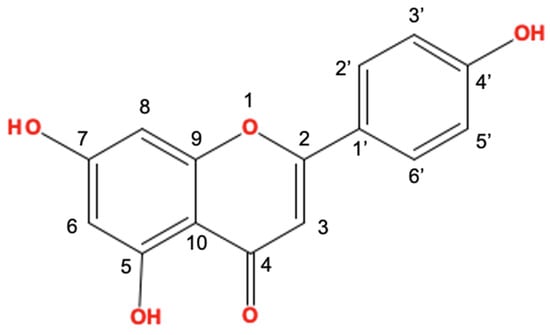 The structure of apigenin (4′,5,7-trihydroxyflavone). This figure was made using JChemPaint software.