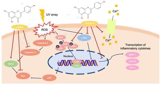 In previous studies, apigenin attenuated skin inflammation by downregulating the expression of cyclooxygenase-2 (COX-2) [36]. Another finding suggests its potential as a novel target for reducing skin inflammation. This compound works in the keratinocyte by targeting the non-receptor tyrosine kinase (e.g., Src) and COX-2 [37]. Apigenin prevented cyclobutene pyrimidine dimers, which are generated by UV exposure. Due to this, apigenin restored the lower level of nucleotide excision repair proteins and affected cell apoptosis [38,39]. Apigenin downregulated the level of metalloproteinase-1 by interfering with the Ca2+ influx-dependent mitogen-activated protein kinase (MAPK) and activator protein-1 (AP-1) pathways in HaCaT or normal human dermal fibroblast cells under UVA-irradiated conditions. Especially, the levels of c-Jun and c-Fos were decreased by apigenin treatment, which suppressed the phosphorylation of extracellular signal-regulated kinase (ERK), c-Jun N-terminal kinase (JNK), and p38 [40,41]. As a result, apigenin could attenuate UV-mediated inflammation by decreasing the transcription of inflammatory cytokines via the downregulation of the AP-1, MAPK, and apoptotic signaling pathways (Figure 3).