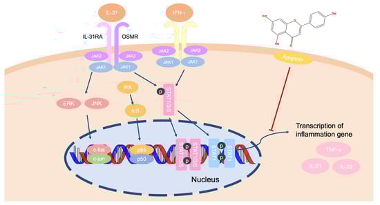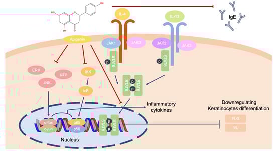 AD is a chronic inflammatory disease that affects 80% of patients in infancy or childhood. Its severe symptoms include itching, dry skin, eczema, and swallowing. The cytokines and chemokines secreted in AD are summarized in Table 1; however, the exact mechanism of the stimulus is still unclear. There are many hypotheses to explain AD pathogenesis, including: (I) disproportion of skin microbiomes [3,42,43,44]; (II) weakness of skin barrier junctions [45,46]; (III) dysregulation between pro- and anti-inflammatory cytokines [47,48]; and (IV) excessive immunoglobulin E (IgE) secretion. Among these explanations, apigenin reduced IgE and interferon (IFN)-γ levels in serum in an NC/Nga mouse model. Moreover, apigenin attenuated damaging skin lesions induced by picrylchloride. Considering the protein levels, apigenin suppressed the phosphorylation of the signal transducer and activator of transcription 6 (STAT6) in IL-4–stimulated mouse spleen cells [49]. In addition, apigenin showed a low expression of IL-31 in messenger RNA in a human mast cell line (HMC-1). In HMC-1 cells, apigenin downregulated nuclear factor-κB (NF-κB) pathway proteins, including the inhibitor of κB kinase, inhibitor of κB, and the p65/NF-κB, and MAPK pathway factors of c-Jun N-terminal kinase, ERK, and p38 [50]. In summary, it is thought that apigenin can ameliorate the symptoms of AD by decreasing the levels of pro-inflammatory cytokines and inflammatory mediators by downregulating the MAPK, NF-κB, and Jak/STAT signaling pathways (Figure 4).