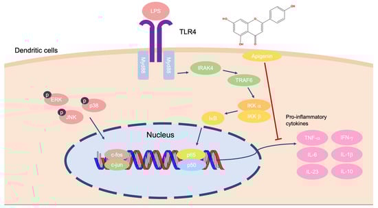 Apigenin showed the greatest effects in a psoriasis model by decreasing cytokine levels. Skin barrier recovery effects were observed in apigenin-treated skin. Apigenin also improved the skin’s condition by increasing the hydration level of the stratum corneum. Meanwhile, apigenin influenced the synthesis of skin structural proteins such as filaggrin, involucrin, and loricrin in mouse models [80]. With co-treatment of apigenin and lipopolysaccharide (LPS) in DCs, this compound significantly inhibited TNF-α messenger RNA expression. Moreover, apigenin suppressed the level of pro-inflammatory cytokines, including IFN-γ, IL-6, IL-1β, IL-23, and IL-10, in both LPS treatment and non-treatment groups. Meanwhile, apigenin affected naïve T cell differentiation by modulating the function of DCs [81]. Overall, apigenin treatment may ameliorate psoriasis symptoms by regulating the transcription of inflammatory cytokines via regulation of the Toll-like receptor 4 pathway (Figure 6).