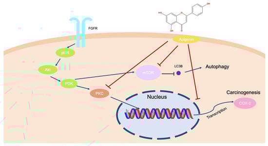 Apigenin downregulates the Akt signaling pathway in UVB-irradiated keratinocytes, blocking the mammalian target of rapamycin (mTOR) activation and suppressing the cell cycle and cell proliferation in mouse skin and keratinocytes. Meanwhile, it promotes autophagy via mTOR inhibition, which inhibits keratinocyte proliferation [95,96]. In primary human epidermal keratinocytes and a skin cutaneous squamous cell carcinoma cell line (COLO-16), treatment with apigenin decreased the conversion of the microtubule-associated protein 1 light chain 3 (LC3) and GFP-LC3 puncta [97]. Apigenin also inhibited skin carcinogenesis by downregulating the COX-2 expression level in UVB-irradiated mouse skins [98]. It is commonly known that 12-O-tetradecanoylphorbol-13-acetate (TPA) can induce a tumor by binding and activating the protein kinase C signaling pathways [99,100]. Apigenin treatment suppressed PKC activity dose-dependently and inhibited TPA-mediated carcinogenesis in mouse skin [101,102]. In summary, it is speculated that apigenin treatment can reduce tumorigenic responses by inducing autophagy and via the inactivation of Akt and PKC in keratinocytes (Figure 7).