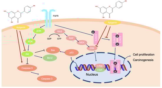 Apigenin inhibited the proliferation of melanoma cell lines by downregulating the AKT signaling pathway, which promotes cell apoptosis [103]. Moreover, apigenin treatment suppressed melanoma metastasis to the lungs in C57BL/6 mice and inhibited the phosphorylation of STAT3 in melanoma cells [104]. The presence of apigenin induced anti-melanoma effects by triggering the apoptosis of A375SM cells. Apoptotic proteins, including the caspases, p53, Bcl-2-associated X protein, and poly ADP-ribose polymerase (PARP), were upregulated by apigenin treatment. The compound also downregulated the levels of Akt, STAT3, and MAPK in melanoma cells [105]. Therefore, it is suggested that apigenin could inhibit carcinogenesis by inducing apoptosis in melanoma cells and downregulating the activities of some important survival factors, such as STAT3, Akt, and MAPK proteins (Figure 8).