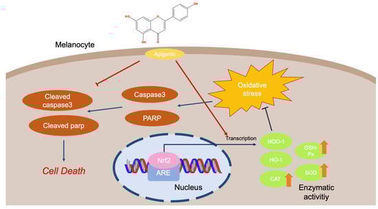 Vitiligo has been reported as a pigmentary disorder impacting about 1% of the world’s population [106]. The symptoms of this disease include inconsistent and various sizes of white spots found on the skin and a change of hair color to white [107,108,109]. The main cause of vitiligo is concerned with the autoimmune chronic destruction of melanocytes. The death of pigment cells expands the white lesions on the skin. Therefore, the therapeutic strategy has focused on preventing the apoptosis of melanocytes from oxidative stress and suppressing the proinflammatory response [110]. Of many different compounds, apigenin was reported to upregulate antioxidant enzyme activities, such as superoxide dismutase (SOD), catalase (CAT), and glutathione peroxidase (GSH-Px). Moreover, apigenin was found to promote the gene expression level that is involved in the antioxidant process the at mRNA and protein levels [111]. Meanwhile, it was revealed that apigenin can affect dopamine (DA)-triggered apoptosis in melanocytes by downregulating cleaved PARP and cleaved caspase 3 levels [112]. Apigenin also protected melanocytes from apoptosis by blocking the phosphorylation of Akt, p38, and JNK, which are induced by DA [112] (Figure 9).