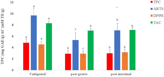 Total phenolic contents (TPC) and Antioxidant capacities using ABTS [2,2′-azino-bis (3-ethylbenzothiazoline-6-sulfonic acid], DPPH [2,2-diphenylpicrylhydrazyl], and TAC [total antioxidant capacity] methods of phenolics released from Fd-APP before and after in vitro gastrointestinal digestion. The values are means of tests performed in triplicate (n = 6). Similar lowercase letters in the error bars indicate insignificant differences (p ≥ 0.05) between before and after digestion extracts within the similar assay.