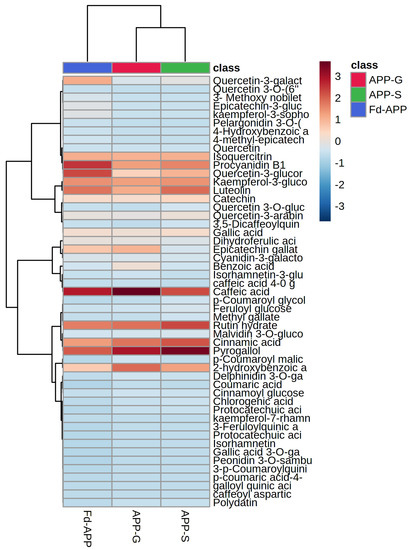 Heatmap showing the concentrations of individual phenolic compounds in Fd-APP (undigested), APP-G (post-gastric) and APP-S (post-intestinal) extracts. Values are expressed as µg/g dw. The full names of the polyphenol compounds present in the heatmap are given in Table S1.