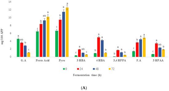 The major phenolic compounds and their catabolism during 72 h of fermentation are shown in Figure 5. Due to the varying intensities of phenolic compounds under different ionization conditions of LC-ESI-QTOF-MS/MS, quantification of fecal catabolites was preferred using HPLC-PDA for complex fecal solutions. Inoculating and incubating the insoluble fraction of Fd-APP with feces extract revealed significantly (p ≤ 0.05) different trends of phenolic compounds than those incubated without feces (blank). Therefore, the phenolic compounds detected in both Fd-APP residue plus fecal and blanks were ignored. Only the parent compounds specific to the action of microbiota were studied. The intact parent phenolic acids and flavonoids were majorly catabolized in the first 24 h of fermentation, while the concentration of most produced metabolites decreased gradually during 48–72 h of fermentation with some exceptions. Protocatechuic acid (PA), pyrogallol and ferulic acid (FA) showed different responses to fermentation and continued to increase in quantities till 72 h of fermentation (Figure 5A). The following detected metabolite; 3- hydroxyphenyl acetic acid (3-HPAA), ferulic acid (F.A), 3-(4-hydroxyphenyl) propionic acid (3,4 HPPA) and 4- hydroxybenzoic acid (4-HBA) were previously reported as metabolites of human fecal fermentation of polyphenols in date seed powder [51]. Previous studies investigating the microbial metabolism of dietary catechins reported the production of benzoic, phenyl lactic, phenyl propanoic, phenyl acetic, and phenyl valeric acids derivatives by various hydroxylation patterns [52], however, valerolactones and phenyl valeric acids were not detected in the present study. The progressive catabolism (75%) of gallic acid (GA) during 72 h of fecal fermentation could be attributed to the consumption of GA as a substrate for maintenance of bacterial fermentation and/or conversion into PA by dihydroxylation reactions [53]. The accumulation and formation of PA during colonic fermentation is consistent with the previous proposed conversion of GA to PA. Jiménez-Girón et al. [54] indicated that generation of 4 hydroxybenzoic acid (4 HBA) and PA by colonic fermentation of flavanols, involves a series of catabolic reactions such as C-ring fission, decarboxylation, dihydroxylation, and oxidation reactions (Figure 5B).