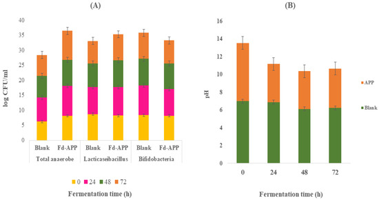 The quantitative changes in the human fecal bacterial populations observed during the in vitro fermentation are given in (Figure 6). Blank cultures (no added Fd-APP) showed insignificant (p ≥ 0.05) changes in the total anaerobic, Lacticaseibacillus or Bifidobacteria counts throughout the 72 h of fermentation. However, fecal samples with added Fd-APP substrate revealed significant (p ≤ 0.05) increases in total anaerobic, Lactobacillus and Bifidobacteria counts after 48 and 72 h of fermentation (Figure 6A). For example, data showed that Bifidobacterium counts increased by 1.90 log CFU/mL after 24 h of fermentation. These results were supported by a previous study which suggested that foods rich in polyphenols, such as Fd-APP, might have a certain influence upon gut microbial activity and composition by preventing or promoting the growth of particular bacterial groups [58]. Such changes in microbial population and composition may also cause catabolic reactions of phenolics, that facilitate the release of 3,4 HPPA, 4HBA and 3PAA following decarboxylation and/or reduction in phenolic acids as discussed before. The pH values of Fd-APP/fecal mix declined significantly (p ≤ 0.05) after 24 h of fermentation (Figure 6B) when compared with the blank (fecal only). On the contrary, blanks showed no changes in pH values during fermentation. Furthermore, the reported decline in the pH after 24 h of samples (Fd-APP/fecal mix) fermentation remained stable throughout the fermentation periods (72 h). Such a decline in the pH value in the presence of Fd-APP could be attributed to the fermentation of Fd-APP and the release of some SCFAs as discussed previously (Section 3.5).