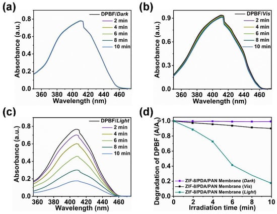 In order to characterize the antibacterial performance of the ZIF-8/PDA/PAN composite membrane in detail, we first used 1,3-Diphenylisobenzofuran (DPBF) as a chemical probe to quantitatively analyze the ability of the composite membranes to produce ROS under different conditions. As shown in Figure 6a,b, the absorbance of the DPBF solution did not change considerably between the conditions of no light and visible light without irradiation, which indicated that the composite membrane produced no, or only a small amount of, ROS under these two conditions. However, under the conditions of simulated sunlight irradiation (Figure 6c), the absorbance of the DPBF solution decreased significantly within 10 min of exposure. By examining the normalized degradation curve of the DPBF solution (Figure 6d), we could deduce that the composite membrane could only produce a limited ROS amount when exposed to visible light, while this ability was greatly enhanced by exposure to simulated sunlight. Together, these data suggest that simulated sunlight exposure substantially improves the ROS yield from the composite membrane.