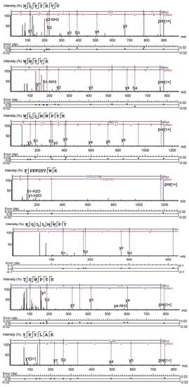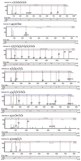 MS/MS diagram of pancreatic lipase inhibitory peptides identified from hydrolysates and the hydrolysates separated by ultrafiltration affinity chromatography.