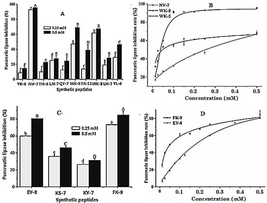 Inhibitory effects and IC50 calculation curves of synthetic peptides identified from hydrolysates (A,B) and the hydrolysates after ultrafiltration affinity chromatography (C,D) to pancreatic lipase. Different letters in the figure represent significant for different groups.