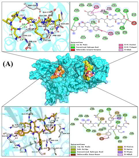 The program AutoDock Vina was used to predict the type of interaction between synthetic peptides and pancreatic lipase. From the protein database (http://www.rcsb.org/pdb) (accessed on 20 May 2022), the crystal structure of pancreatic lipase (PDB ID:1ETH) was downloaded. Chem 3D was used to draw the 3D structure of the synthetic peptide; the charge by hydrogenation of the 3D structure of protein and synthetic peptide was calculated through AutoDock tools, and then the AutoDock Vina docking program was run. The docking parameters of the synthetic peptide and the whole pancreatic lipase we set as bellows: the central coordinates were x = 57.8, y = 44.8, z = 125.2, and the docking box size was x = 44, y = 30.0, z = 32.9, energy_ Range = 4, exhaustion = 10, Number modes = 10. The docking parameters of synthetic peptide and the active site of pancreatic lipase were set as the central coordinates: x = 72.1, y = 31.1, z = 144.7, the size of docking box: x = 92.6, y = 72.3, z = 145.7, energy_ range = 4, Exhaustiveness = 10, Number modes = 10. PyMOL was used to draw the three-dimensional interaction structure diagram of synthetic peptide and enzyme, and Discovery Studio 2016 was used to draw the two-dimensional diagram and the interaction type after docking was analyzed.