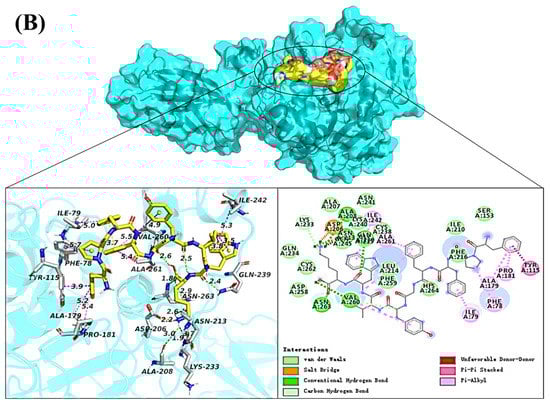The binding of FK-9 to pancreatic lipase at the catalytic site was shown in Figure 3B. FK-9 had only one binding site with pancreatic lipase, and the molecular docking energy was −8.4 kcal/mol. At the active pocket, FK-9 can form six hydrogen bonds with amino acid residues Ala208, Asn213, Gln245, Gly215, Asn263, and Val260, and had hydrophobic interaction with Ile242, Ala261, Asn213, Val260, Ile79, Phe78, Ala179, Pro181, and Tyr115, electrostatic interaction with Asp206, and were consistent with fluorescence quenching > 0, > 0. Hydrophobic and electrostatic interactions were the main driving forces of FK-9 binding to pancreatic lipase.