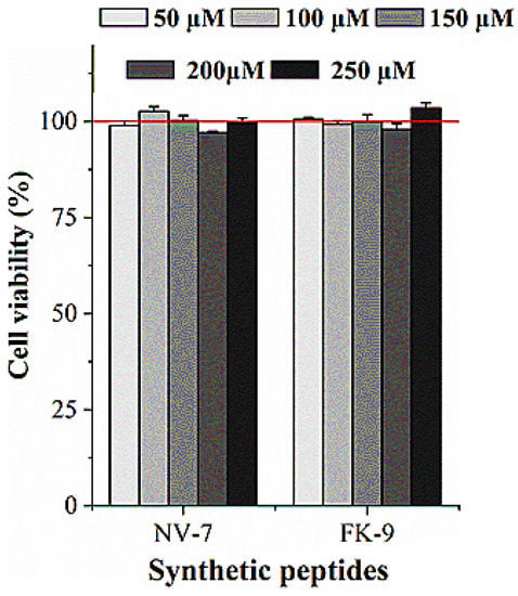 The effect of synthetic peptides on the proliferation of HepG2 cells was detected by the MTT method. It can be seen from Figure 4 that at the concentration of the synthetic peptides 50 μM–250 μM, the activity of HepG2 cells was not significantly reduced, indicating that the peptides were basically non-toxic to HepG2 cells.