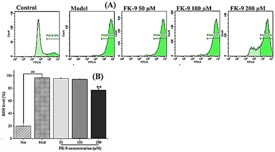 Cells were cultured according to the above induction method, sucking the culture medium, washing twice with PBS, and adding 2 mL (10 μM) of DCFH-DA to each group. Then, they were incubated in a CO2 incubator (Froma series II, Thermo Scientific, Guangzhou, China) at 37 °C for 30 min, the DCFH-DA was sucked, and washed with PBS three times. Then, 0.5 mL of trypsin was added to digest for 1 min, followed by 1.5 mL of serum-free medium, and inhaled into a 2 mL centrifuge tube, before being centrifuged at 78 g for 10 min. Finally, the culture medium was poured, resuspended with PBS, and detected by flow cytometer.